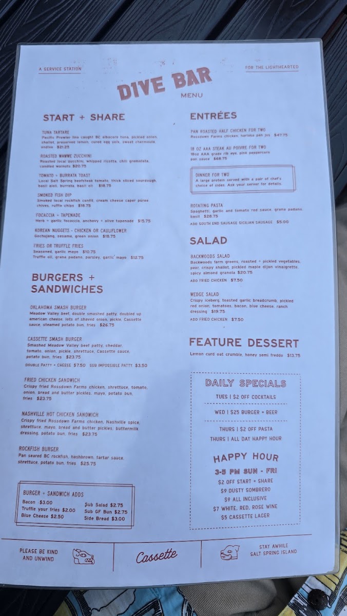 The menu at Cassette Cafe and Dive Bar offers a relaxed selection of satisfying café fare and casual bites, crafted to complement the laid-back atmosphere of Salt Spring Island life. Whether you're winding down with a coffee or settling in for a meal, you’ll find a balance of comforting flavors and thoughtful twists.